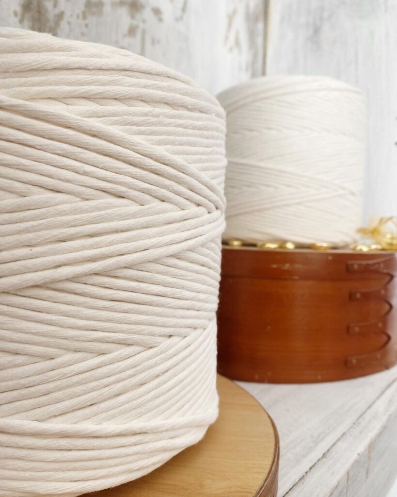 - Corde en coton peigné : Également appelée « single twist », cette corde, constituée d’un seul brin torsadé, est douce et souple. Bien qu’elle soit plus difficile à travailler sur de longues distances en raison de sa tendance à se défaire facilement, son rendu lisse est parfait pour des franges et pompons impeccables.