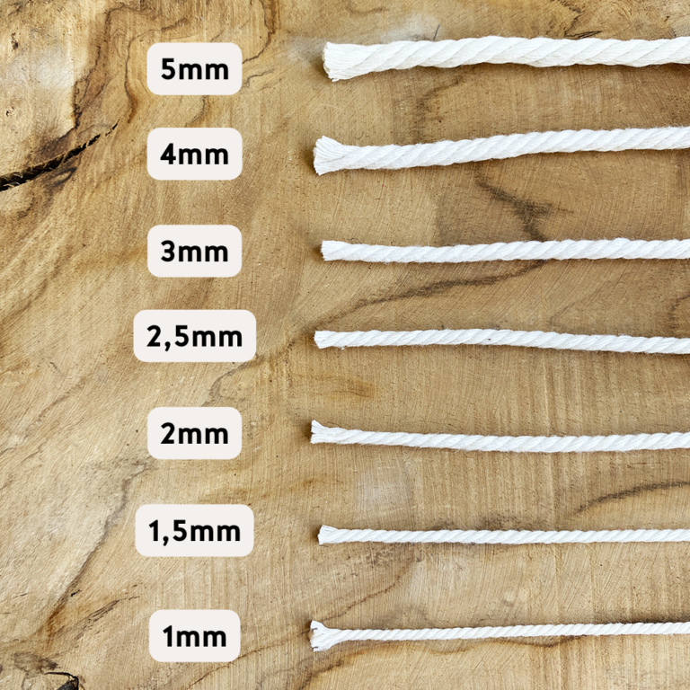 Le diamètre de la corde dépendra de votre projet. Pour des petites pièces comme des porte-clés ou des marque-pages, préférez les petits diamètres pour un rendu raffiné. Pour les grandes pièces, choisissez un diamètre plus gros pour réduire le nombre de nœuds nécessaires. Gardez à l’esprit que plus la corde est épaisse, plus elle peut être difficile à travailler. Si vous débutez, nous vous conseillons d’utiliser la corde en coton torsadé de 2,5 mm ou 3 mm, qui se tient facilement et est parfaite pour l’apprentissage des nœuds de macramé. Dans la plupart des cas, le choix du diamètre sera aussi une question de goût personnel.