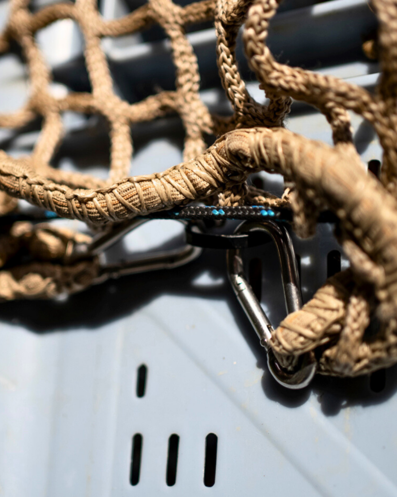 - Le filet est accroché à cette corde élastique à l’aide de mousquetons (mousquetons plats à œil ou mousquetons pompier).