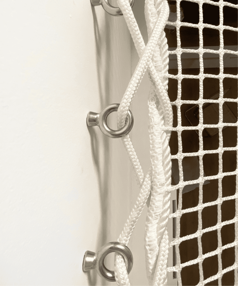 Le type de vis à privilégier dépend de la nature de la paroi (bois, béton, acier...). Un filet de repos ne peut jamais être fixé directement à du plâtre, placo ou BA13 pour des raisons de sécurité. Dans certains cas, il est d’ailleurs recommandé de poser un cadre en bois ou en acier pour sécuriser l’accroche. On conseille 1 piton ou 1 pontet tous les 15 cm.
