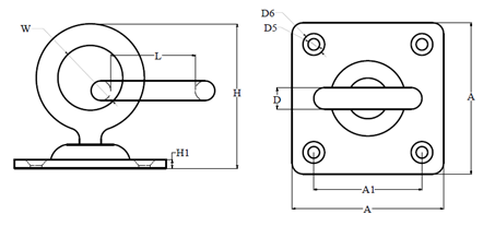 | Ø axe (D) | Largeur platine (A) | Largeur œil (W) | Hauteur platine (H1) | Largeur fixation (B) | Hauteur totale (H) | Ø perçage (D1) | Longueur œil (L) |